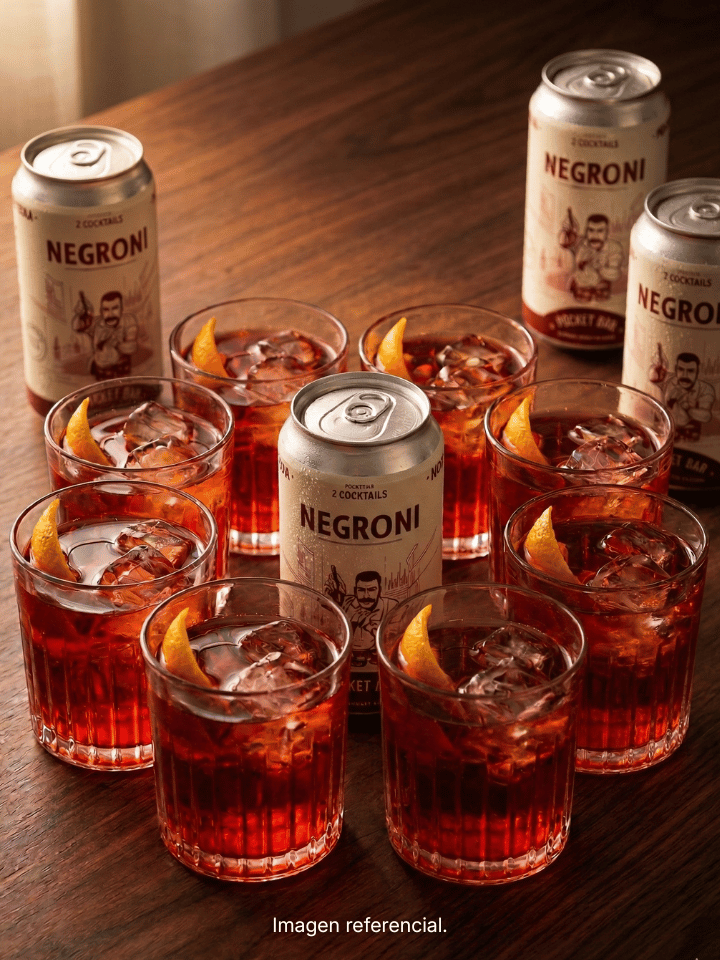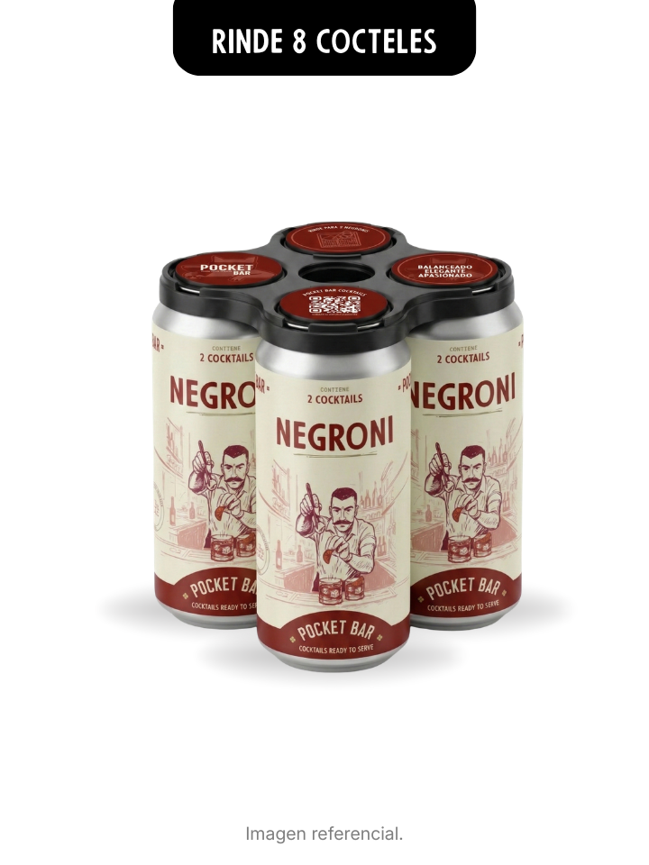 El Four Pack Pocket Bar Negroni reúne 4 latas listas para servir donde el gin, el vermouth rosso y el campari se integran en una mezcla intensa, elegante y perfectamente balanceada que mantiene intacta la esencia de este ícono de la coctelería.